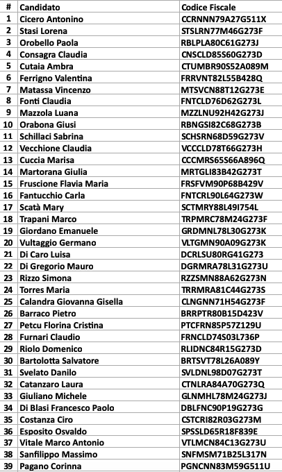 A seguire l'elenco dei 39 ammessi alla prova scritta. In allegato i file pdf con le domande e le risposte corrette dei test.